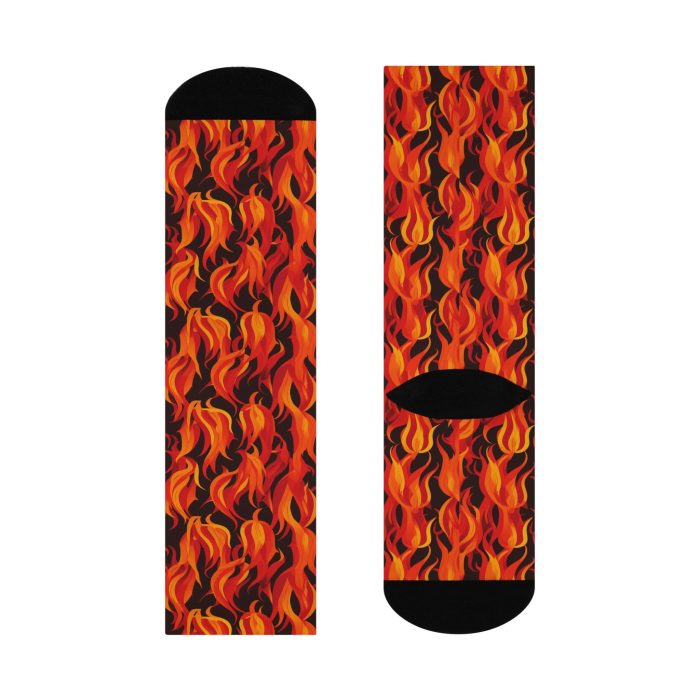 The fire print is an eye-catching and unique pattern that adds a touch of intensity to any look. The bright orange and yellow flames stand out against a black background, making these socks a statement piece.