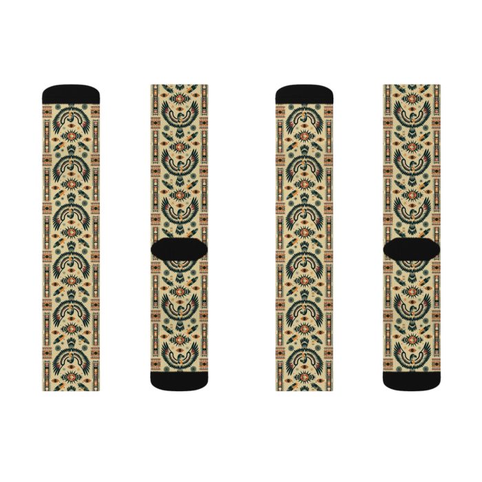 Elevate your sock game to majestic new heights with the “Eagle’s Flight: Soaring Spirit Sublimation Socks”. These aren’t just socks; they’re a tribute to the powerful symbolism of the Native American eagle, representing courage, wisdom, and freedom. Adorned with this noble bird’s outstretched wings and surrounded by eye-catching tribal motifs, each pair encapsulates the spirit of the skies. Crafted with care, the vibrant imagery on these socks is achieved through sublimation printing, a technique that ensures the colors stay bright and the details sharp, wash after wash. The comfortable and stretchy fabric conforms to your feet, offering both support and a soft embrace. Whether you’re stepping into the boardroom or hitting the trail, the “Soaring Spirit” Sublimation Socks will carry the energy of the eagle with you, inspiring every step with a sense of grandeur and freedom. Show off your unique style and connect with a rich cultural legacy with every wear. These high-quality socks with sublimated print provide optimum comfort with style wherever one might go – a subtle accent to complement an office look or an eye-catching statement for an extravagant outfit.