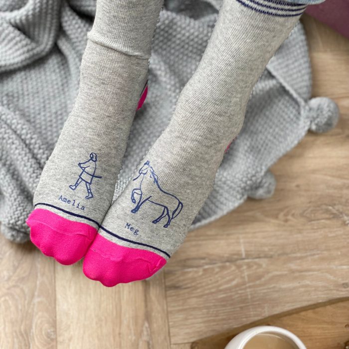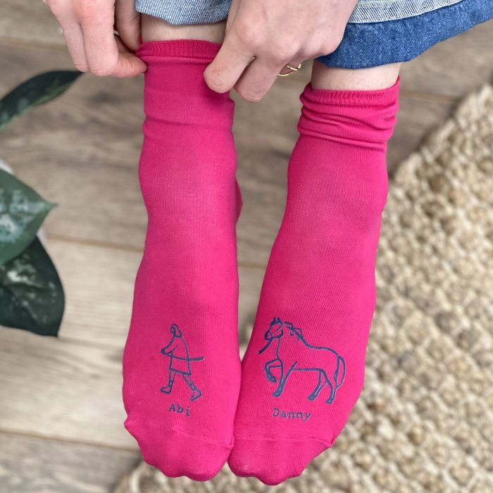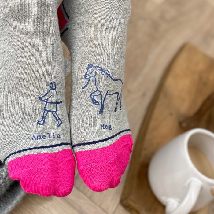 These lovely and soft socks come in either grey with pink toes to fit size 4-7, or grey with red toes to fit size 7-11. Printed onto the toes is a lovely, and personalised, illustration of you walking your horse.
