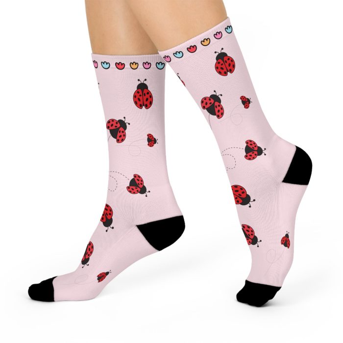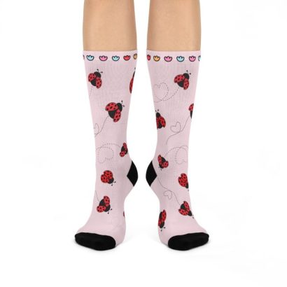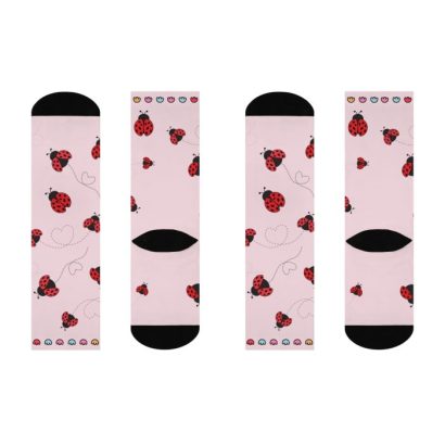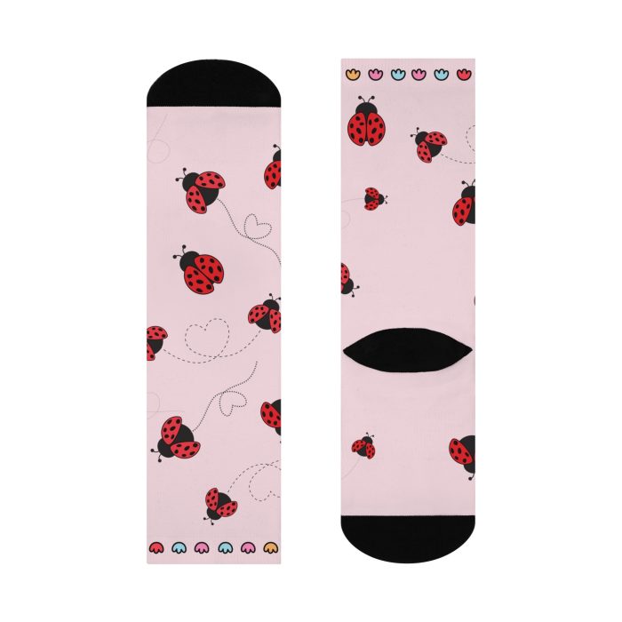 These Ladybug socks are a one-size style designed with both function and appearance in mind. Ladybugs are believed to bring protection and good fortune. With the fully cushioned heel-to-toe, these socks provide superior comfort, while the DTG print process allows for ultra-crisp, crease-free printing. Composed of 73% polyester, 18% nylon, 6% spandex, and 3% cotton, these socks are an elevated alternative to the typical sublimation sock and provide a clean, comfortable base for your all-over print designs.