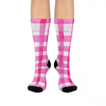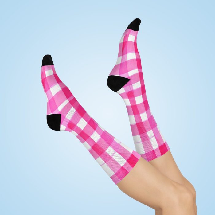 But what truly sets these socks apart is their undeniable style. The striking pink hue and sweet gingham design make them a statement piece that’s sure to command attention and elevate your look to new heights. Pair them with your favorite sneakers, boots, or even clogs for an effortlessly chic ensemble that exudes confidence and individuality.