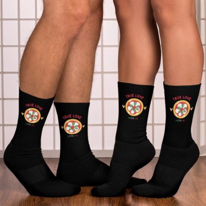 These socks are extra comfortable thanks to their cushioned bottom. The foot is black with artwork printed along the leg with crisp, bold colors that won’t fade.
